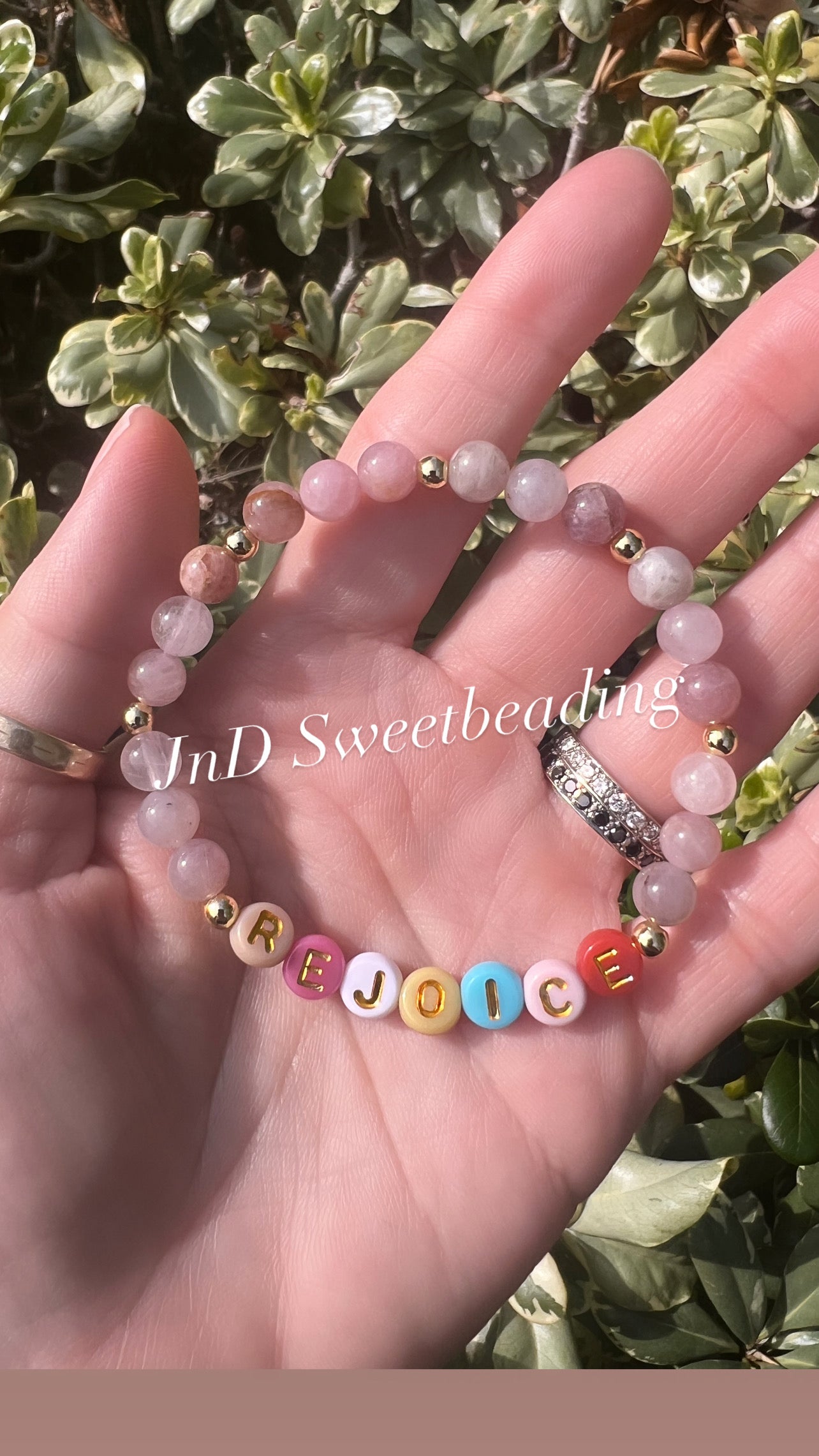 This bracelet is made with 6mm pink amethyst and 14k gold fill beads, with the word Rejoice. This bracelet can help you start your day with a little extra joy around your wrist.
